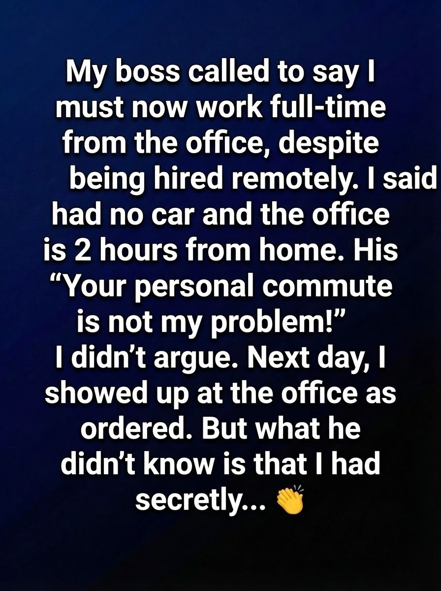 When my boss called late one afternoon, I expected nothing more than a quick check-in. Instead, he told me that effective immediately, I was required to work full-time from the office. I was stunned. I had been hired as a remote employee from day one. When I explained that I didn’t own a car and lived nearly two hours away, his response was cold and final: my commute was not his problem. I didn’t argue. I thanked him, hung up, and spent the evening thinking quietly.